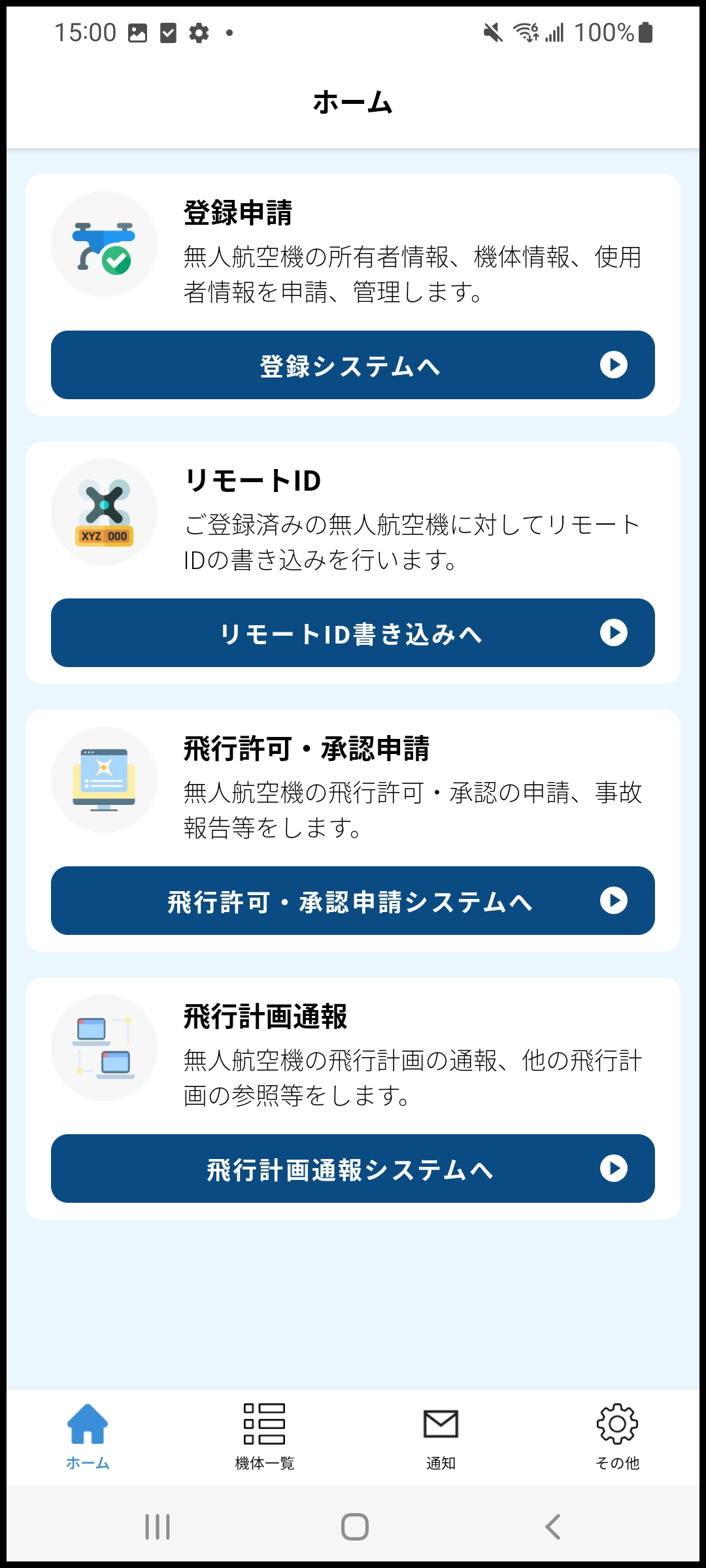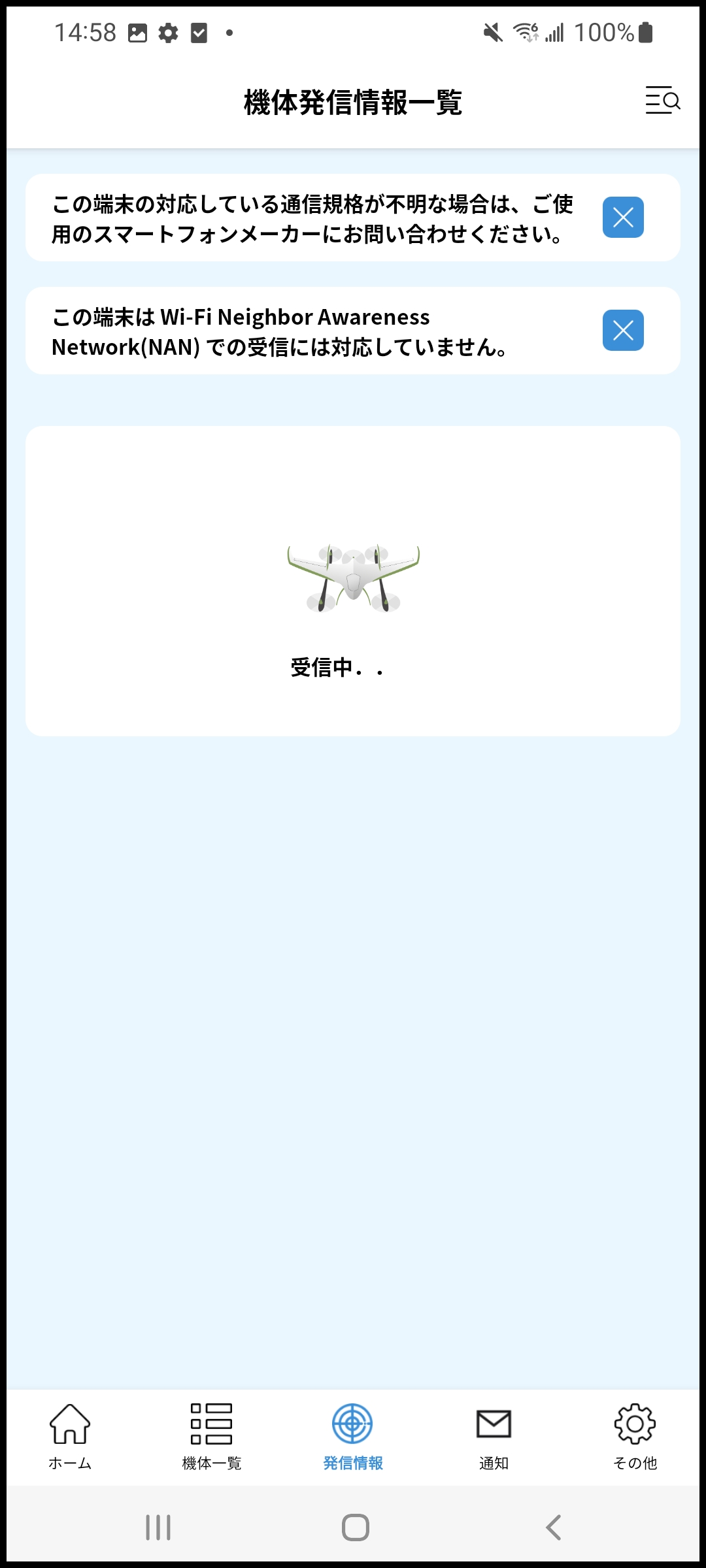 リモートID情報を受信するにはBluetooth 5.x Bluetooth LE Long Range、Wi-Fi Neighbor Awareness Networking、Wi-Fi Beaconのいずれかの通信規格に対応した端末である必要があります。