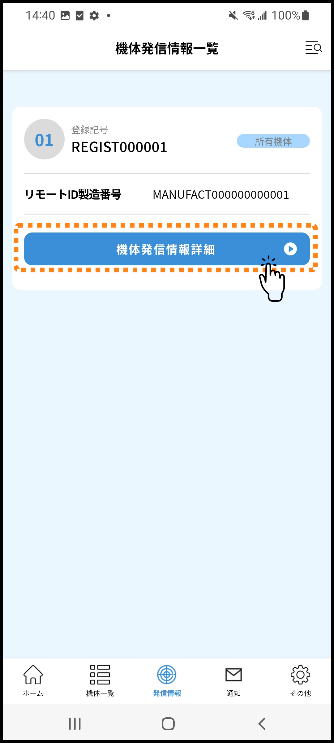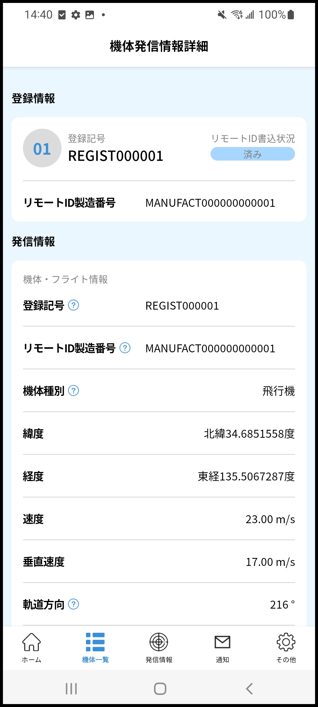 ドローンを選択し、「機体発信情報詳細」ボタンを押すことで、詳細を表示することができます。(所有者以外の個人情報は見ることはできません)